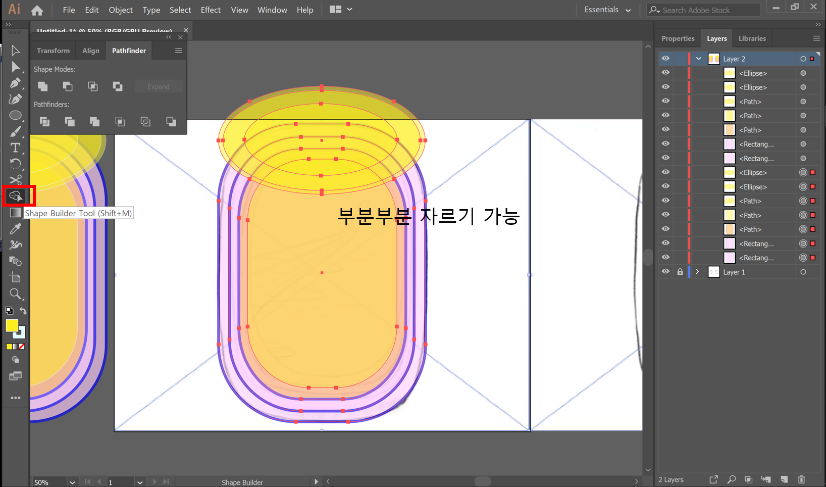 저렇게 선택한 선 따라 자르기를 하고 싶다면 shape builder tool을 이용해서 잘라내버리는게 가능하다.