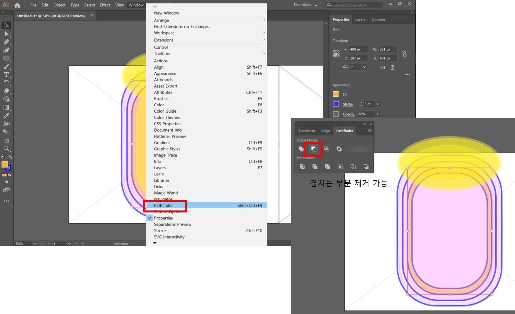 Window-> pathfinder를 이용하면 겹치는 부분을 제거할 수 있다.
