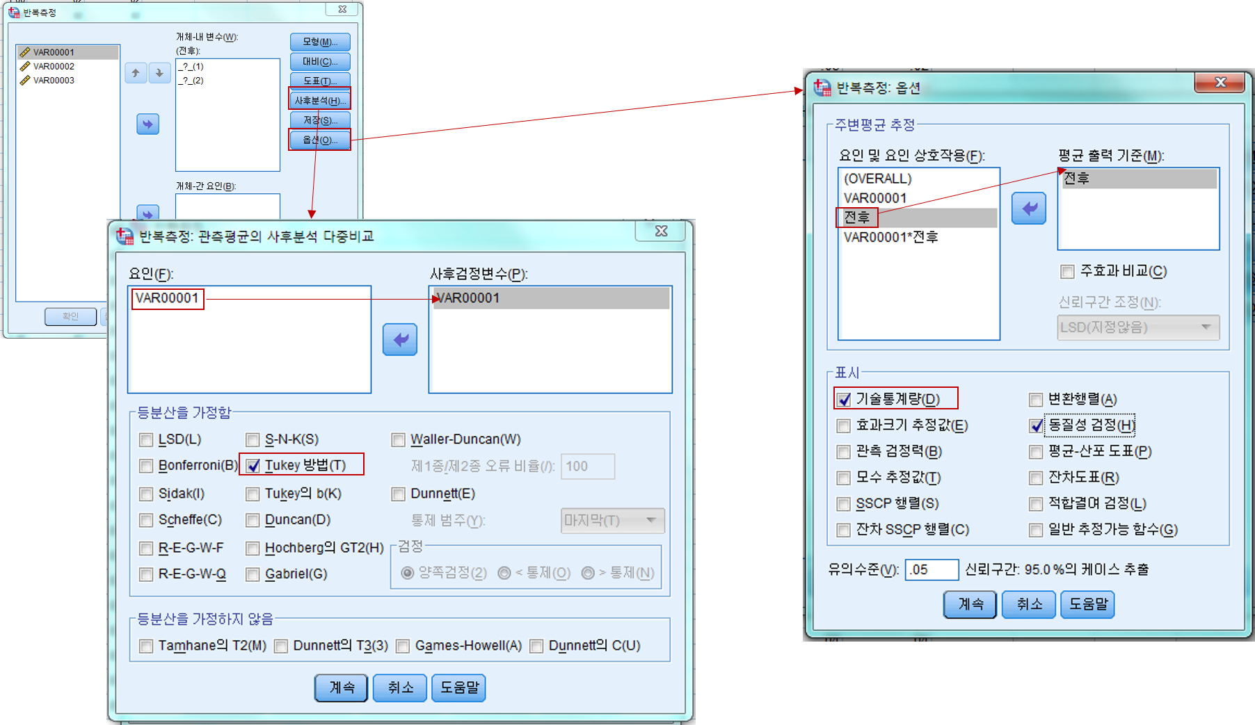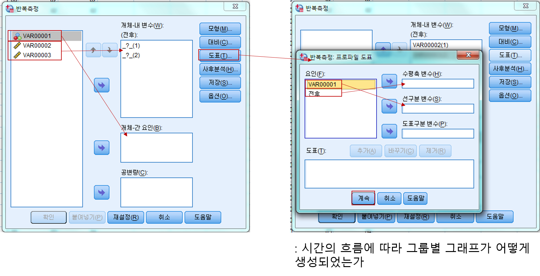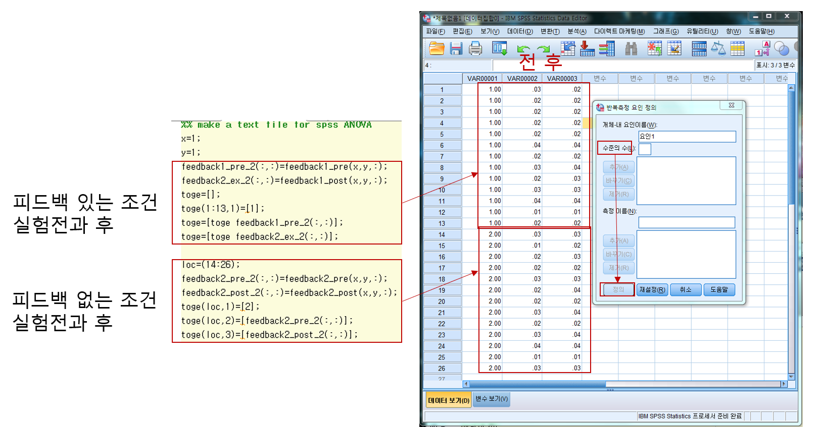 : 분석->일반선형모형->반복측도->'요인 1'을 '전후'로 수정->수준의 수를 2로 지정->정의