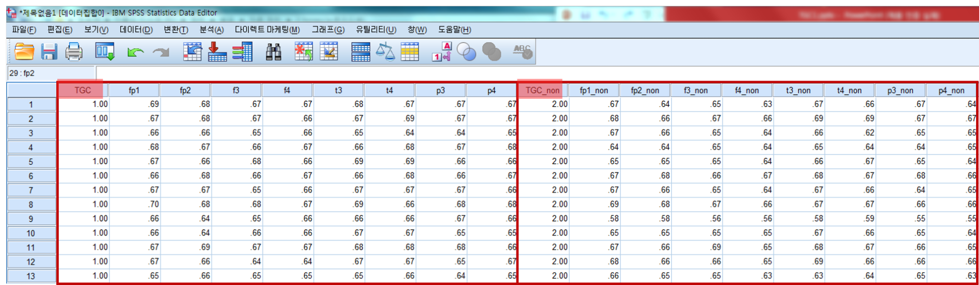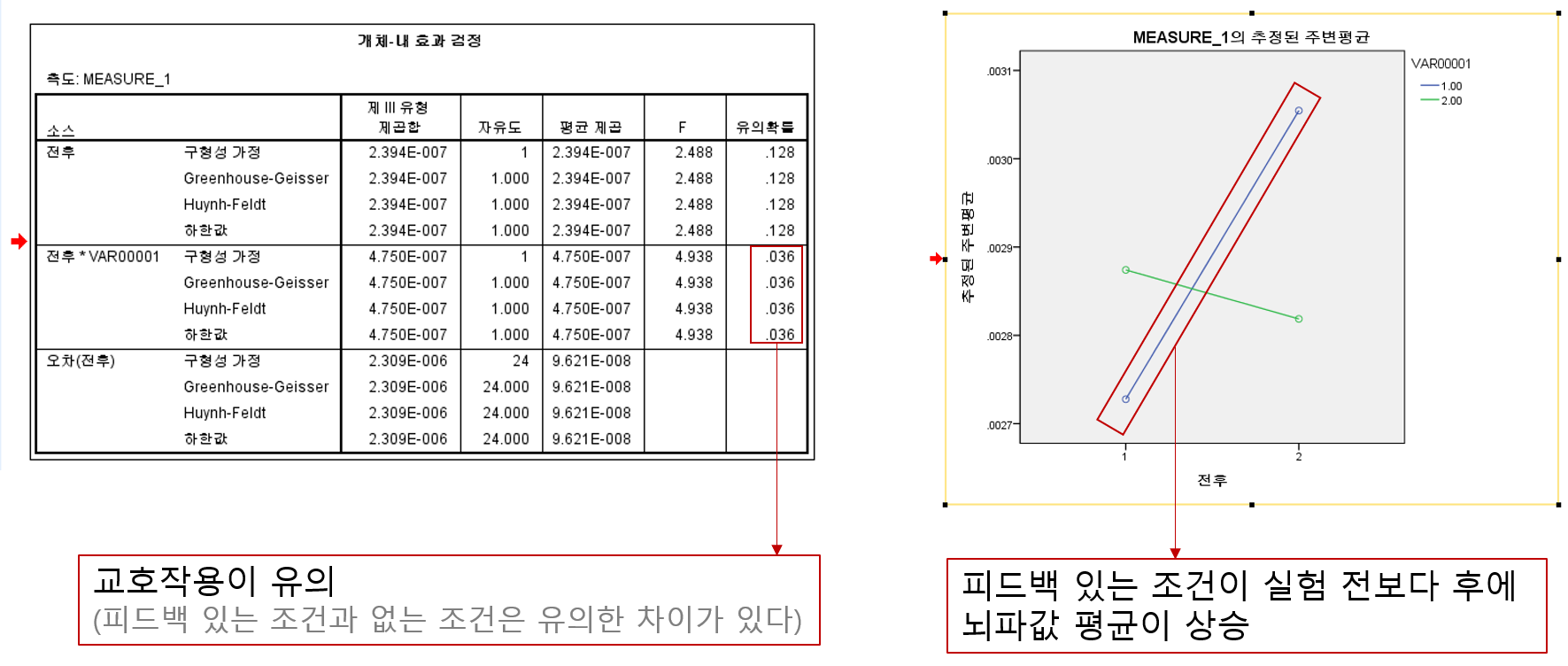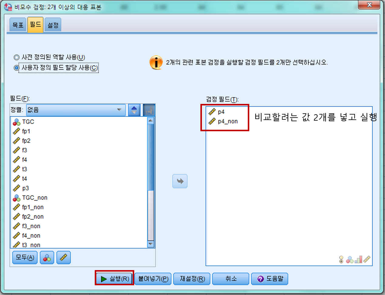 : 분석->일반선형모형->반복측도->'요인 1'을 '전후'로 수정->수준의 수를 2로 지정->정의