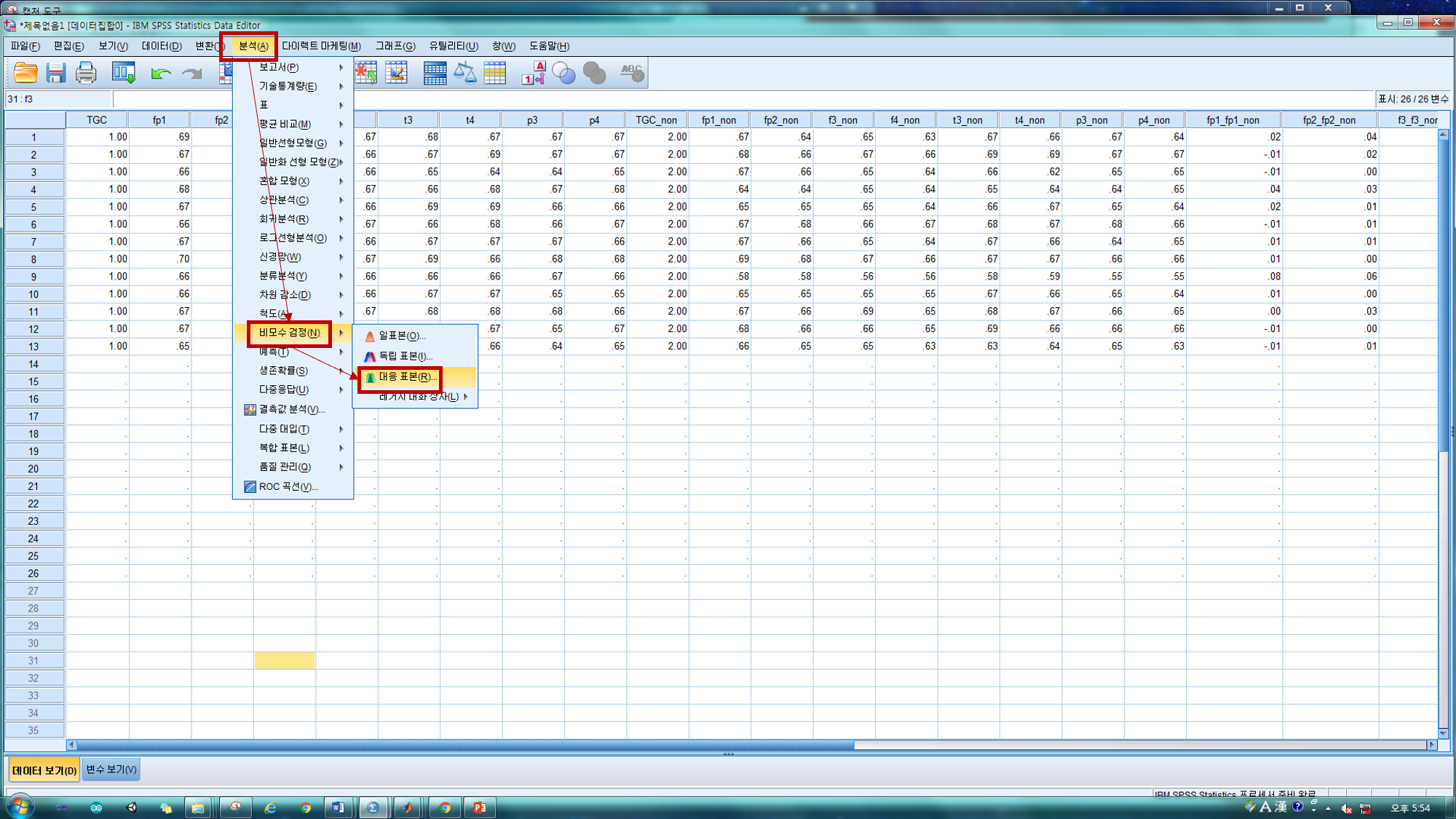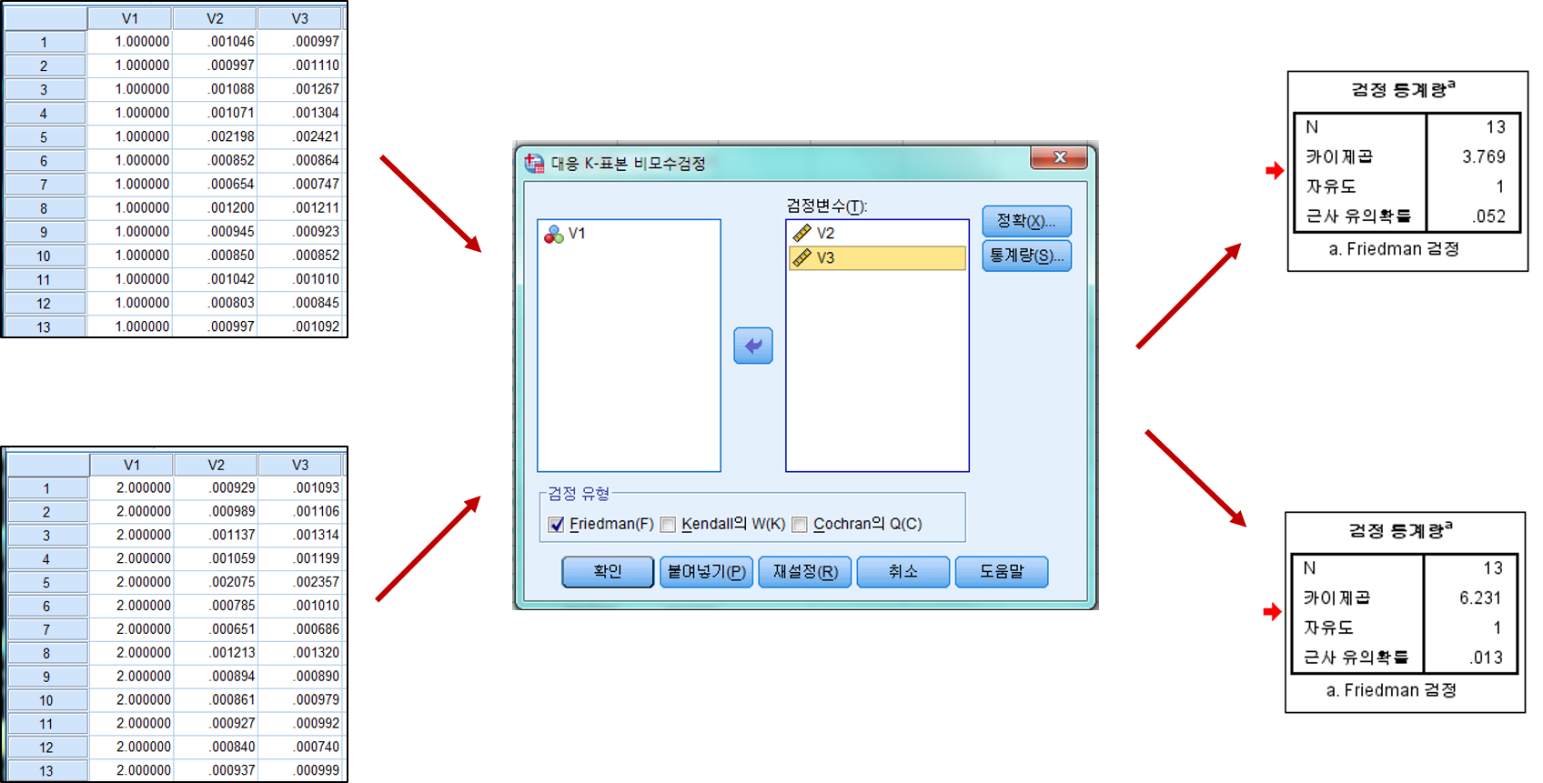 : 분석->비모수 검정->레거시 대화상자->대응 k-표본