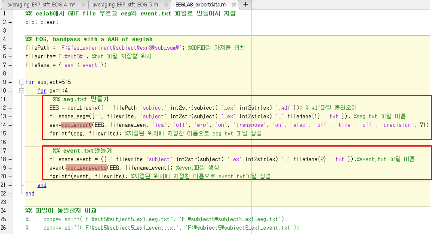 분석을 실시 할 때 eeg.txt와 event.txt로 분리해야 하는 경우가 있는데 이를 eeglab에서 일일이 분리하는것도 가능하나..... 피험자 수가 수십명에 달하고 한명당 얻어낸 파일들이 많을 경우 점점 복잡해지고 까먹을 경우 그걸 알아차리는 것도 힘들다.
