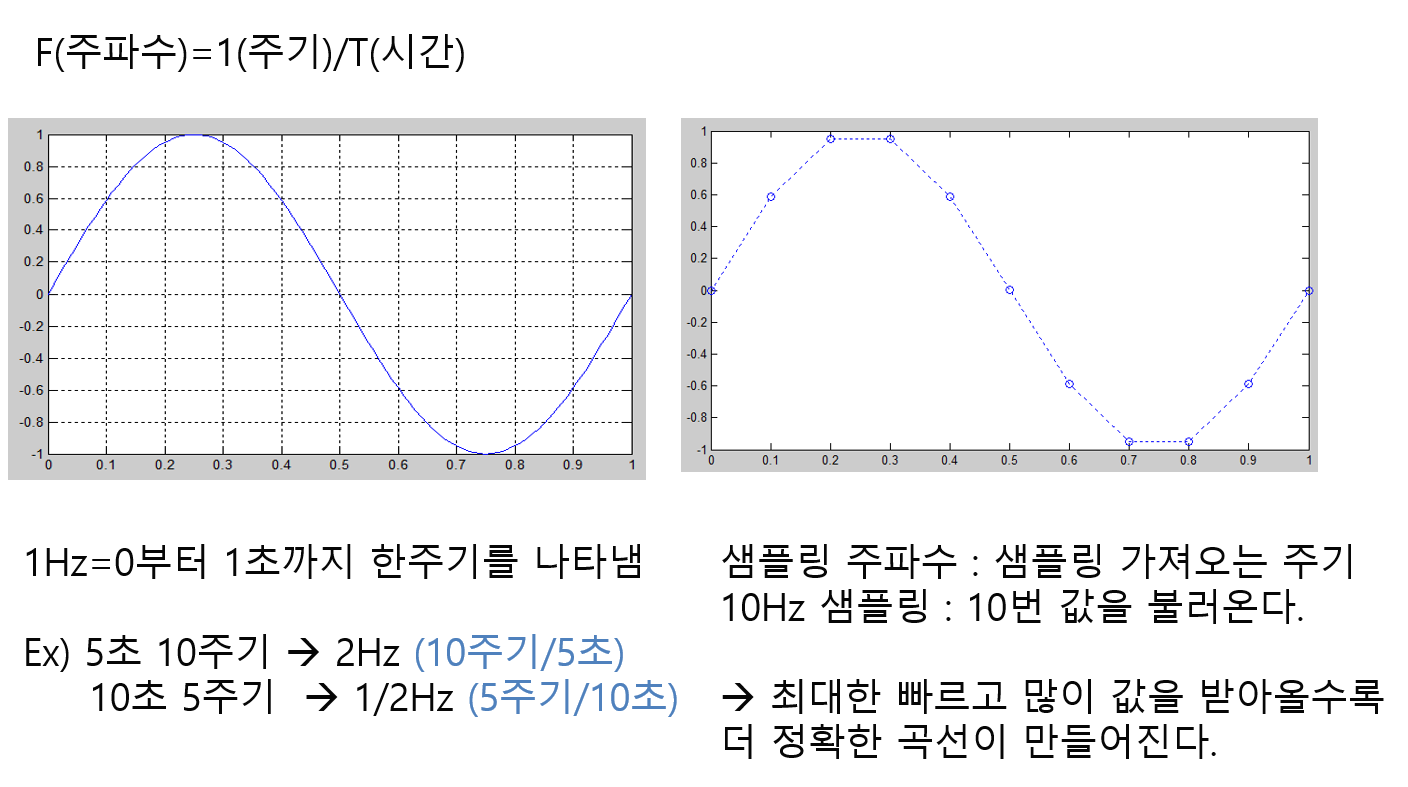 왼쪽 그림은 1Hz를 나타내는 모습이다. x축이 0부터 1초를 뜻하고 y축은 -1부터 1까지 크기를 보여준다.