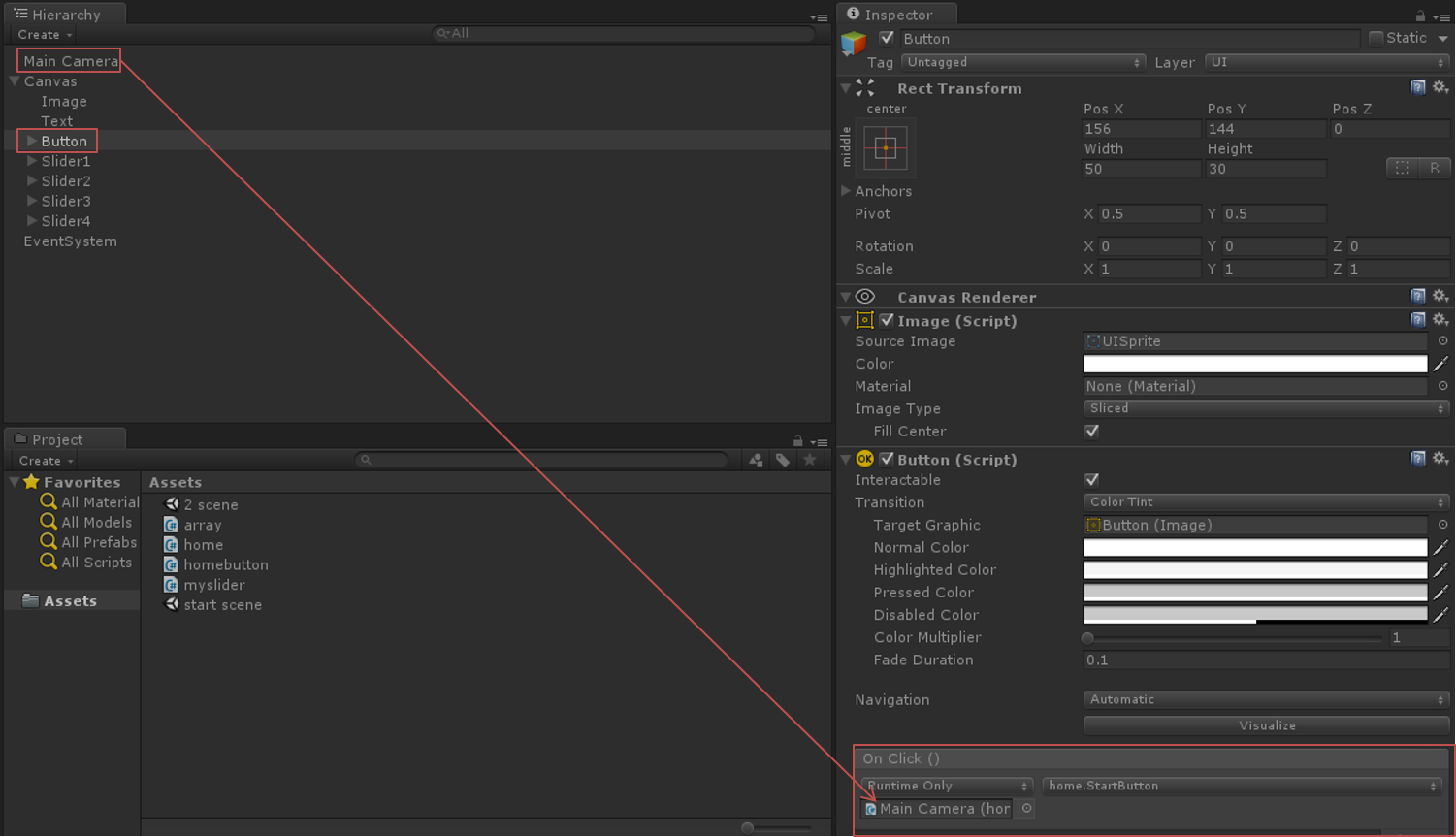 그리고 해당 버튼에서 버튼 클릭시 씬 이동할 수 있도록 main camera를 붙여넣고 만들어준 스크립트의 함수를 지정해 줍니다. 함수를 지정해 주지 않으면 해당 버튼을 아무리 눌러도 지정된 함수가 없기 때문에 동작하지 않습니다.