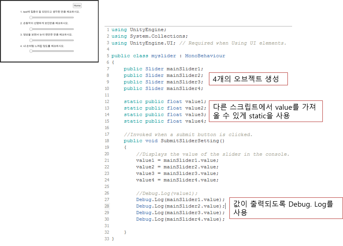 아무튼 슬라이더바를 이용해서 점수를 얻는 것이기 때문에 C코드 약간만 배우고 unity를 한번도 다뤄본 적이 없는 초보가 겁없이 뛰어들다가 많은 고통을 받았다.ㅠ