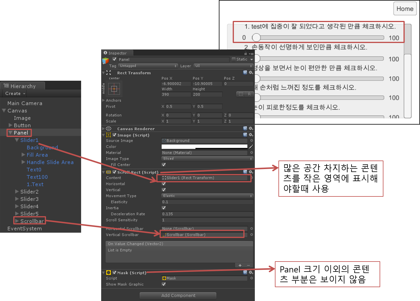 그리고 Panel 밖에서 슬라이더바를 하나 만들어 주시고 vertical scrollbar에 붙여서 스크롤바 역할을 가능하도록 만듭니다.